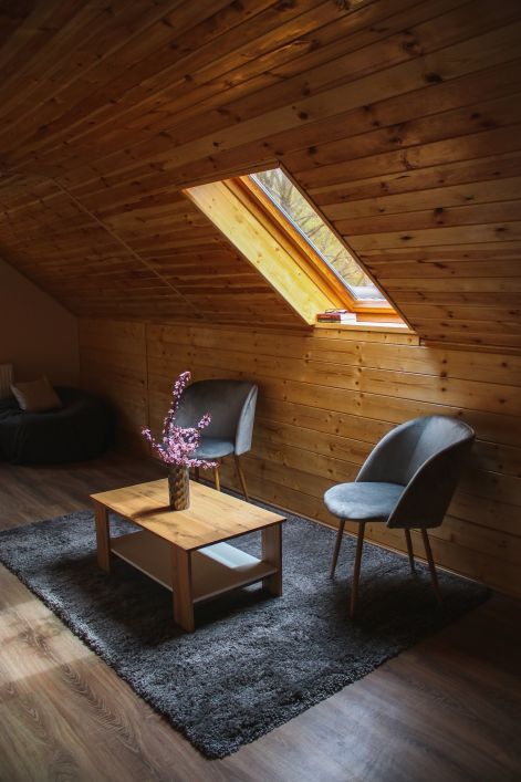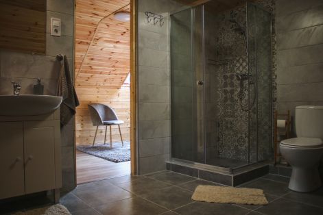 A tetőtéri fürdőszobát fenyő lambéria és szürke burkolat teszi igazán különlegessé. Hajszárítót biztosítunk.